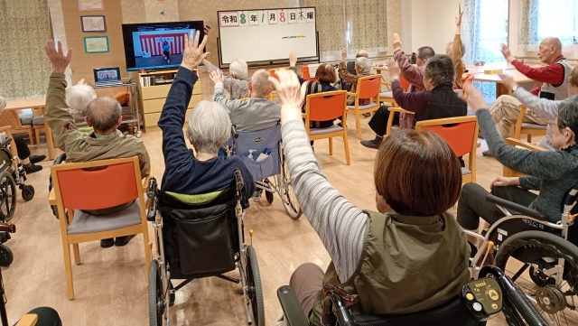 ☆集団体操・・・週に1回、基本は座りながら全身ストレッチ・筋力強化/全身持久力運動を取り入れています