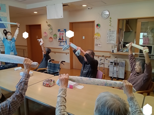 健康を保つため、体操やヨガなどの運動は毎日行い、ときには専任トレーナーが訪問し会話も楽しい運動教室を開催しています。