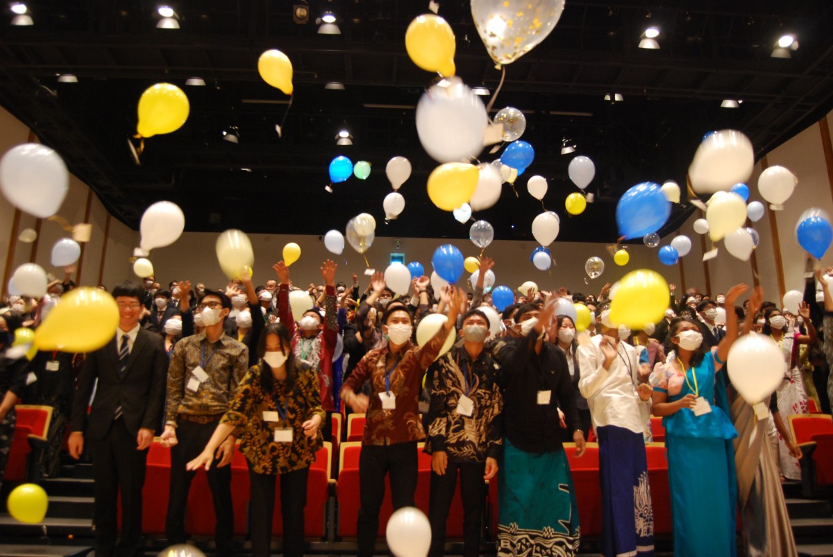 特定技能外国人の皆さんは、其々の民族衣装を纏い、華やかな雰囲気のなかで式典が進み、123名の辞令が読み上げられた後、「ファーストミッション」として、全新入社員が将来の目標や決意を記入したメッセージカードを風船に取り付け、一斉に空へと飛ばしました。