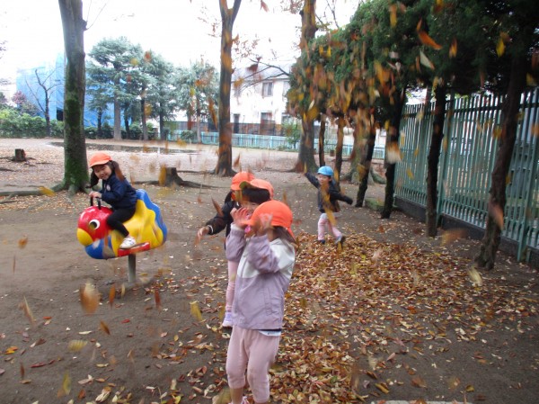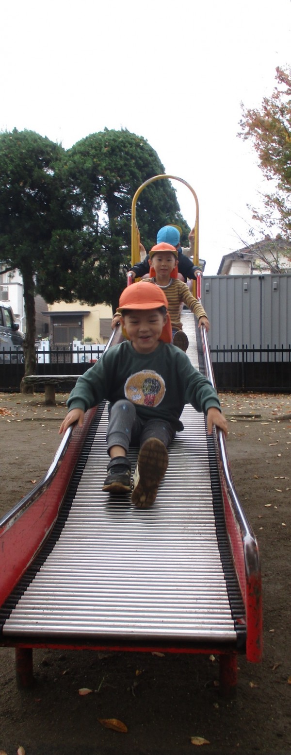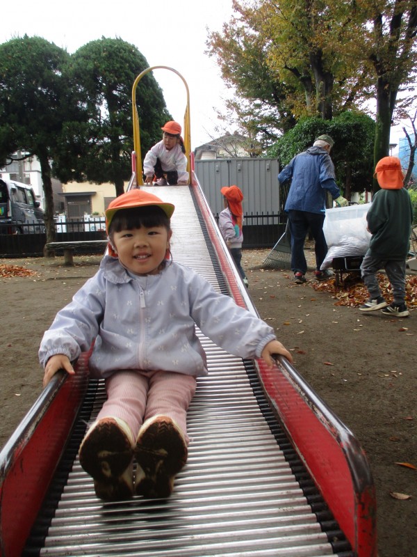 当日は雨上がりでしたが、公園に行き落ち葉を拾ったり、滑り台をしたりして遊びました。
