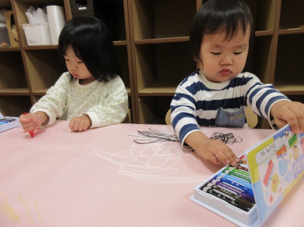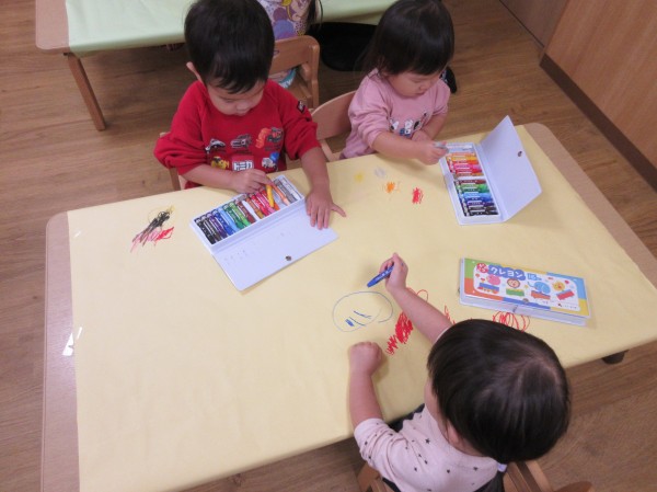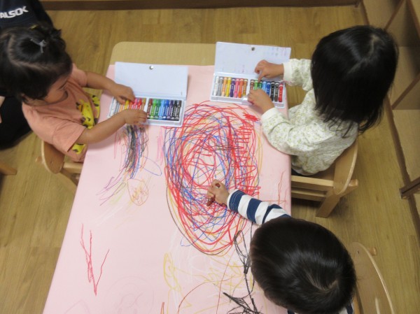 大きな紙を前に、各々好きな色のクレヨンを持ち自由にお絵描きを楽しみました(^^♪