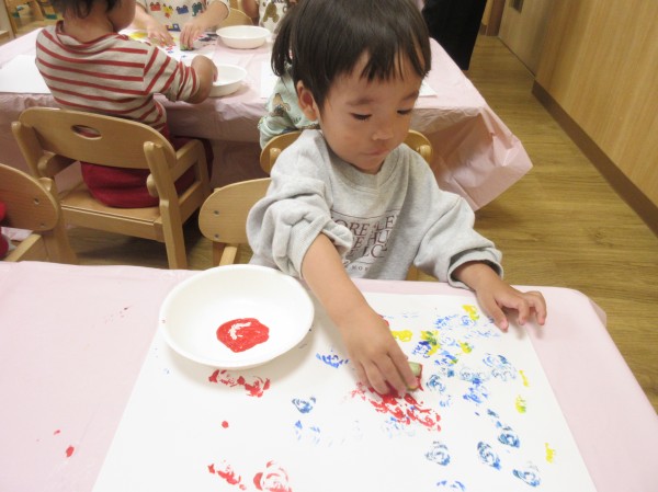 給食室より小松菜の根元の調理で使わない部分をもらい、スタンプして楽しみました!
