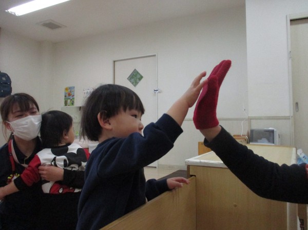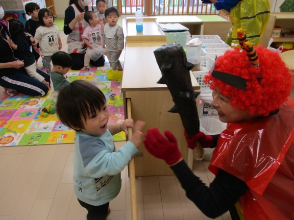 その後、乳児クラスは各クラスに鬼さんが遊びに来てくれました。
