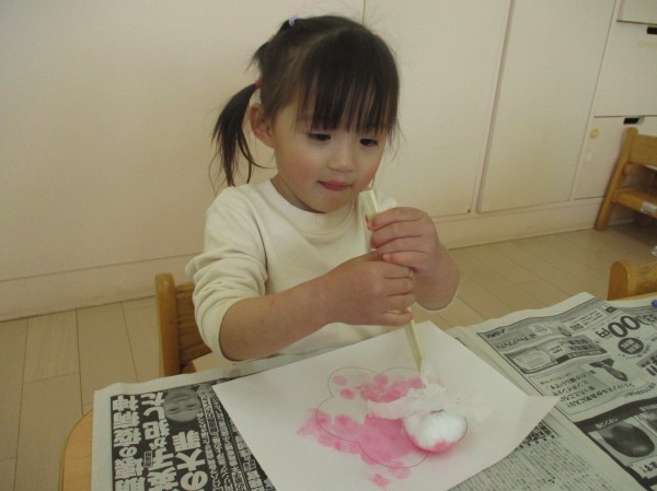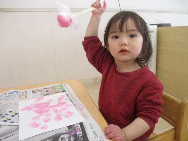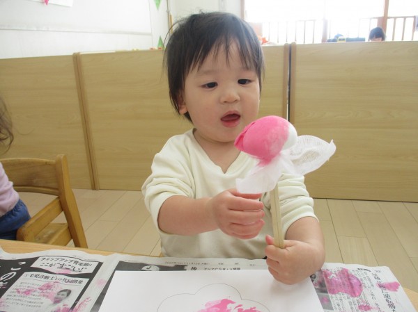 タンポで桃色のお花を作ります。あひる組はピンク色が好きな子が多いので、「ぴんく!」「かわいいね」とポンポン色付くのがとっても楽しそうでした。