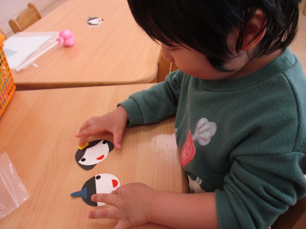 口の向きを反対にして貼ってしまった子は「あれ?」と気付いて貼り直し、「ニコニコになったよ!」と嬉しそうな笑顔を見せてくれました。