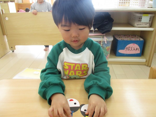 保育園にも大きくて素敵な雛人形が飾られて興味津々で見ている子どもたち。「みんなのお雛様も作ろう!」と言うと「つくる!」「おひなさま~」とワクワク笑顔で楽しみにしていました♪