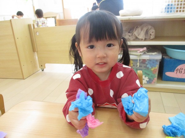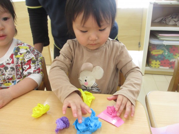 次はお花紙をくしゃくしゃ丸めて画用紙に貼り、着物を作ります。