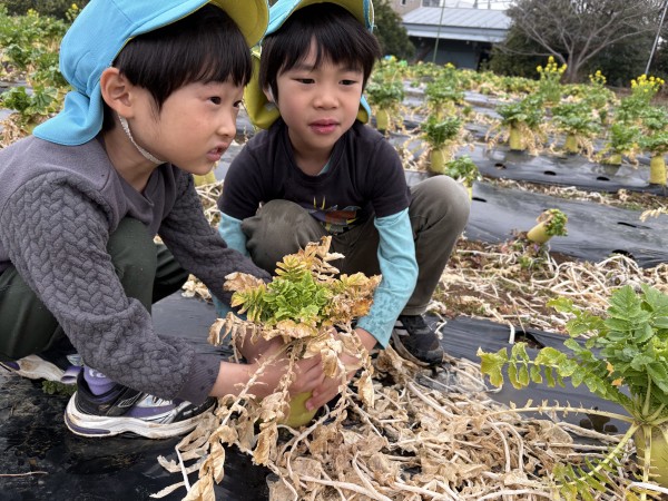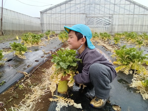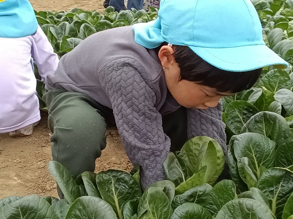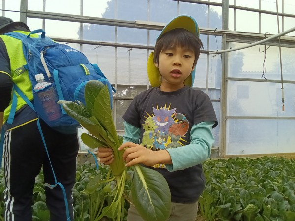 初めての小松菜の収穫。こちらも思いの外、土が固くて…あちらこちらで尻もちを着いていました。