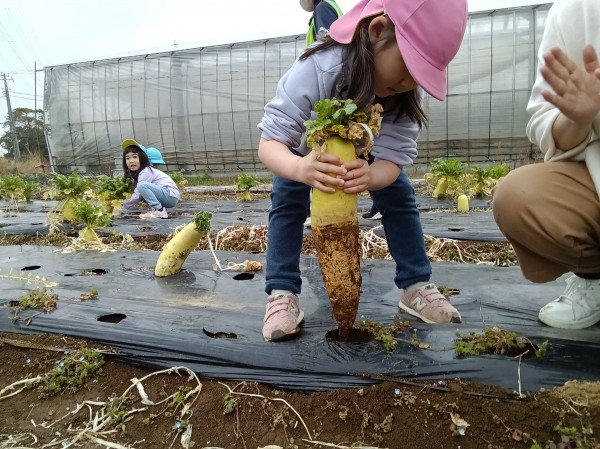 大根の収穫では、以前よりも土が固くなっているので、踏ん張らないと抜けませんでした。