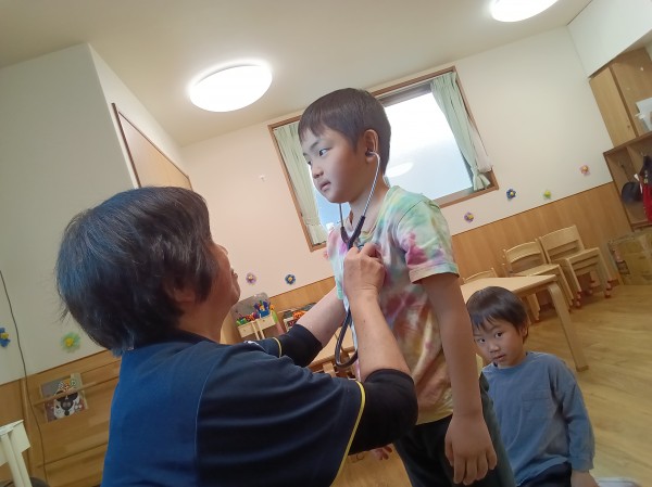 体長数センチの頃に心臓が動き始めてから今まで、みんなの心臓はずっと動いていることを伝え、自分の心臓の位置を確認しました。位置と大きさを確認した後、心臓の音を聴診器で聞いてみることにしました。