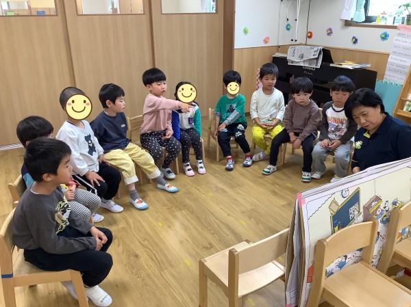 4月は、全職員に「船橋市で起こりうる災害とその備え」の研修を実施いたしました。近年発生が予測されている地震や、温暖化の影響での集中豪雨などの災害の危険性と、どのように備えるべきかを周知しました。今回、こどもたちについても、「自分の命は、自分で守る」ために、防災教育を行いました。日本赤十字社の防災教材「ぼうさいまちがいさがし」を使って、室内の危険な場所や、地震から身を守る行動についてお話をしました。