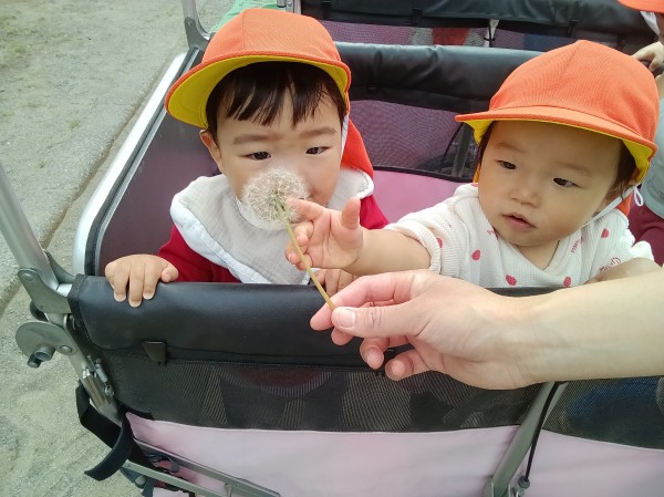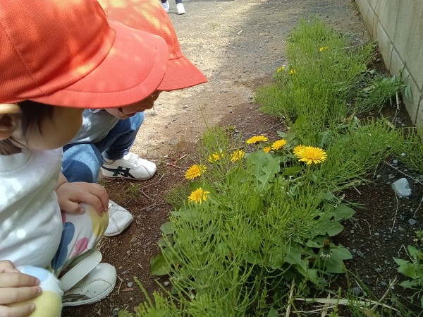 お散歩へ出掛けると、たんぽぽや桜の花びらなどの春の自然を見つけ、観察したり触れたりと興味津々な子ども達です。