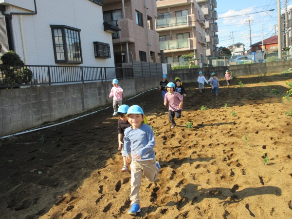 菜の花摘みをさせていただく畑に移動すると「せっかくだから走ってもいいよ!」と言っていただき、大喜びで走り回る子ども達。
