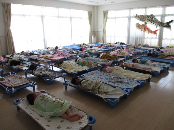 広いホールで大きな鯉のぼりに見守られて、みんなスヤスヤ眠っていますね。