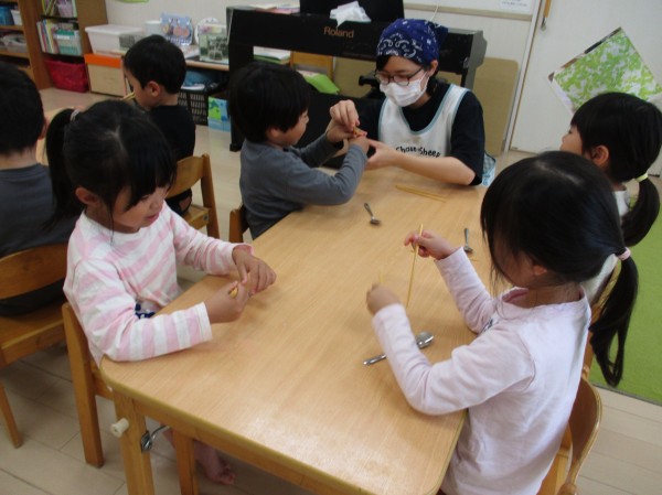 スプーンやお箸の正しい持ち方を教わったりと、真剣な眼差しで話を聞きながら行っていました。