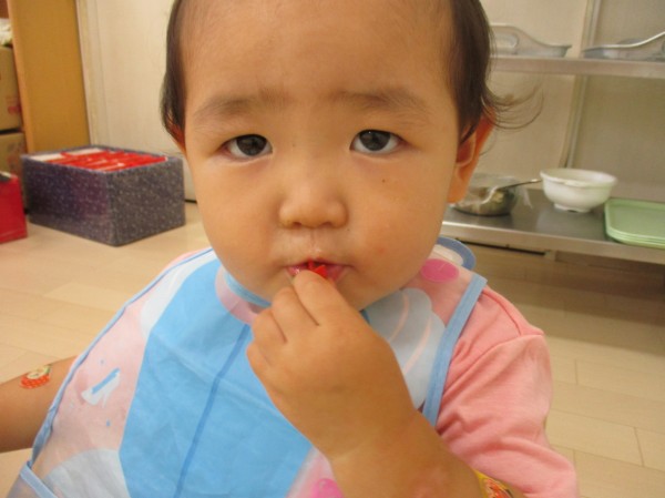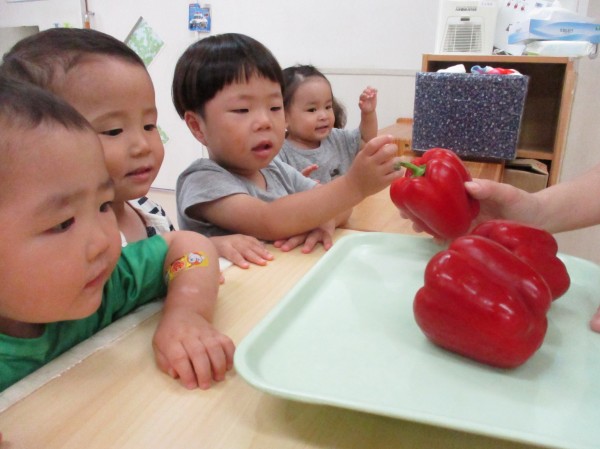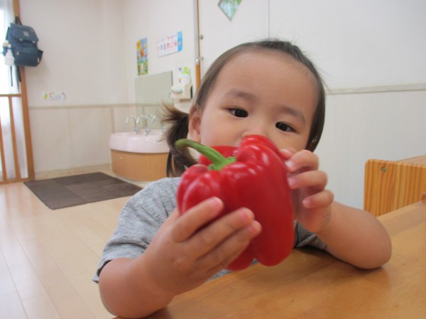 給食の先生と一緒にあひる組のお部屋にやってきたのは、ピカピカの赤いパプリカ。