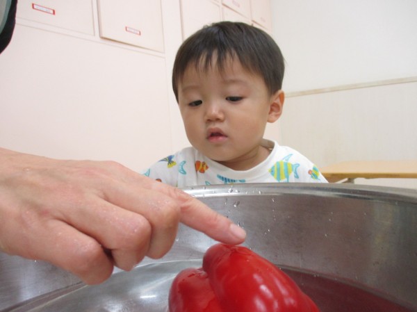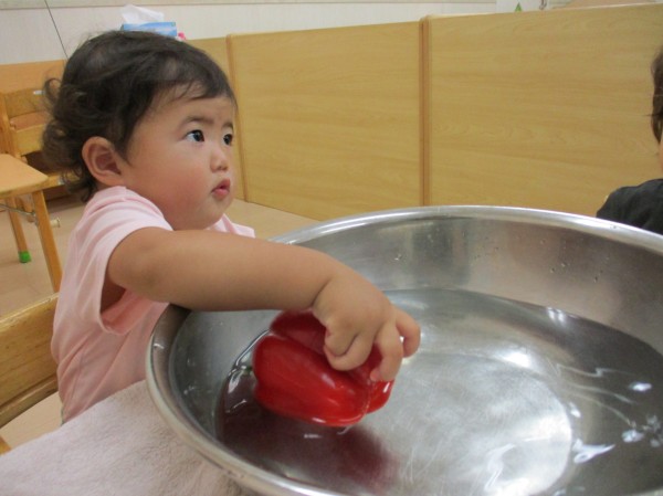 こどもの家・志木中宗岡 食育☆パプリカ洗い あひる組(1歳児)