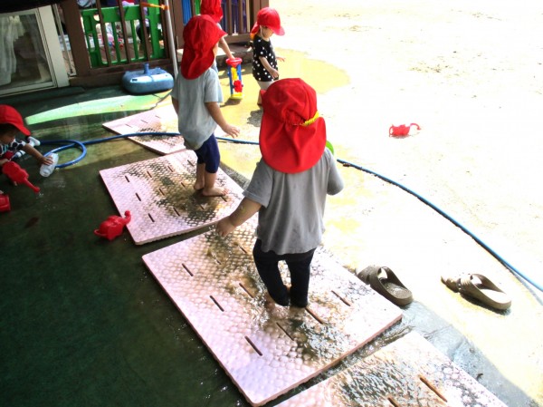 園庭は暑いですが、日除けを設置して準備万端。さっそく遊びに行きましょう!