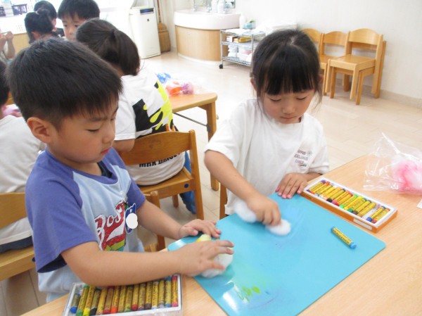 7月中旬に保育園で夏祭りがあり、その日に向けて、年長組のくじら組さんで夏祭りの準備を進めています。