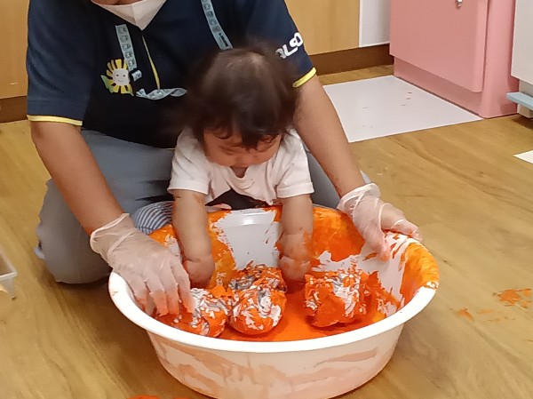 入園当初はお座りしたり、一人で歩くことが出来なかった子ども達も今では上手にハイハイをしたり、トコトコ歩くことが出来るようになりました。視野が広がり、周りの様々なものに興味津々の子どもたち。五感を使って楽しむ様子をご覧ください。
