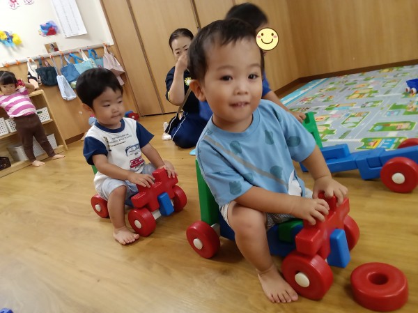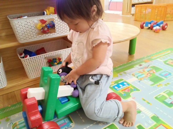 保育者が車を作ると嬉しそうにお部屋をドライブしたり、ぬいぐるみをのせたりして楽しんでいました。壊れてしまっても、すぐに保育者に助けを求めずに「自分で直してみよう」という気持ちが見られ、頑張って自分なりに考えながら修理していました。