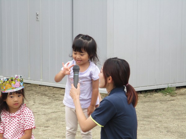 1人ずつ名前を呼んで前に出て、【何才になりましたか?】【好きなものは何ですか?】のインタビュー★