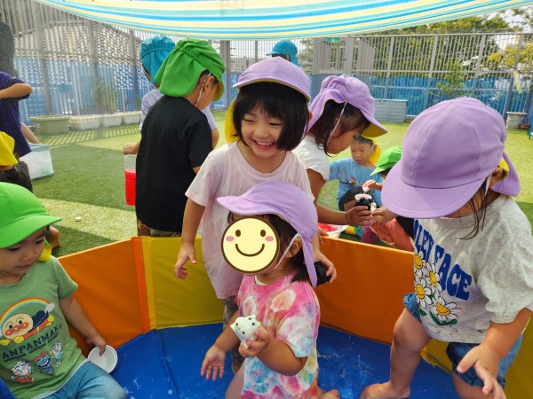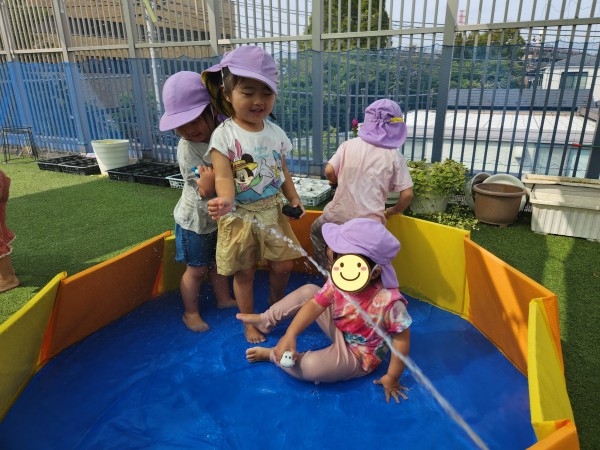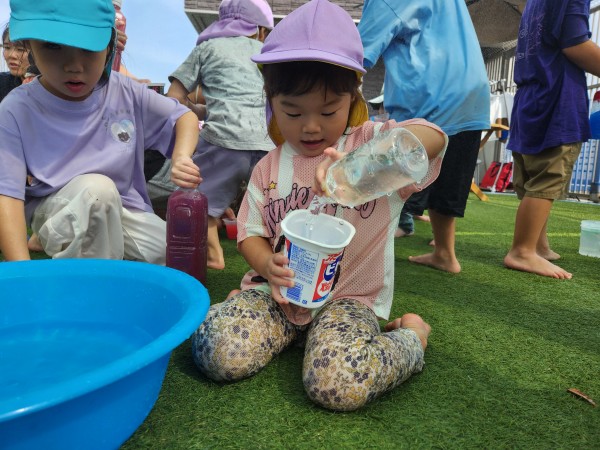 屋上に行ってみると、幼児組のお友だちがたくさん!色水遊びやプール遊びをしていたので、一緒に遊びました。お兄さんたちが作った色水を興味津々に見ていて、自分だちでも色を混ぜて作って楽しんでいました。