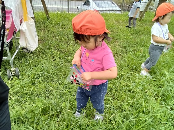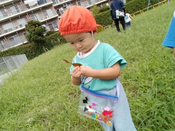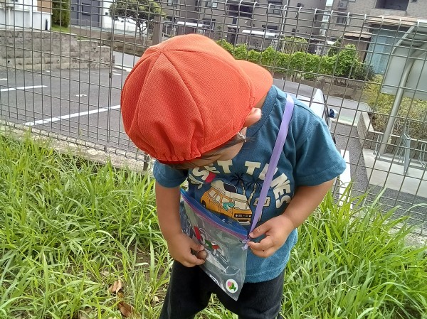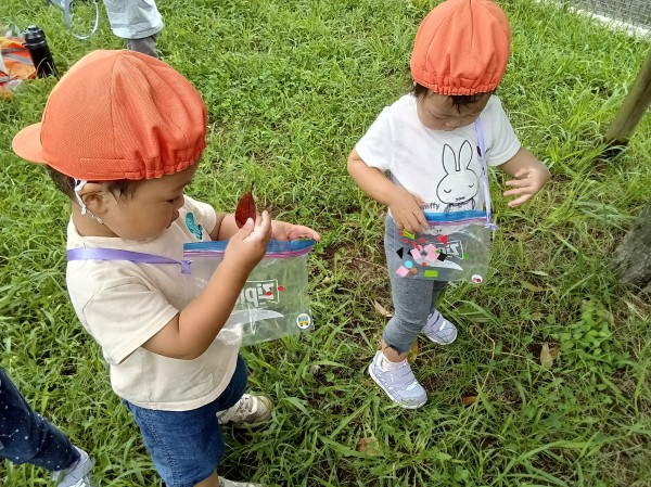 以前作ったお散歩バッグを首から下げて、公園にお散歩に行きました。お散歩バッグを持っていることで、いつも以上に歩く気持ちが高まり、全員が歩いて出発することができました。公園に着くとどんぐりや葉っぱがたくさん落ちていて、うれしそうに自分のバッグの中に入れていました。