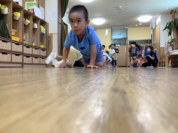 体操は、ドラえもんのラジオ体操、ディズニー体操の他に、初めて「チェッチェッコリ」に挑戦しまいた。どんどん早くなる音楽に笑いが止まらなくなってしまった子どもたちでした。