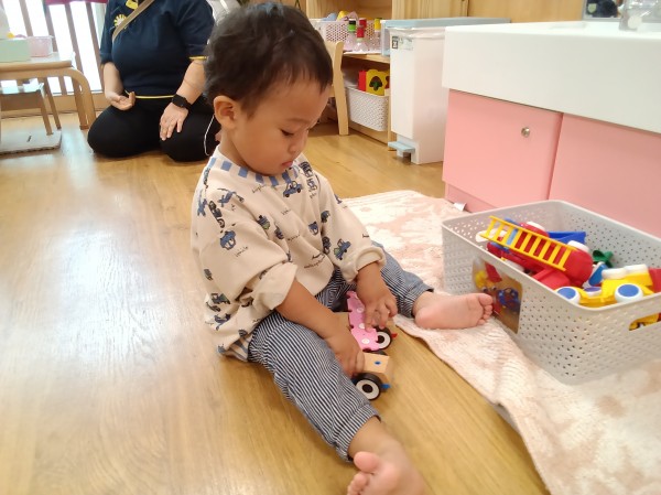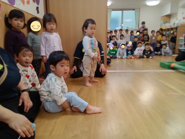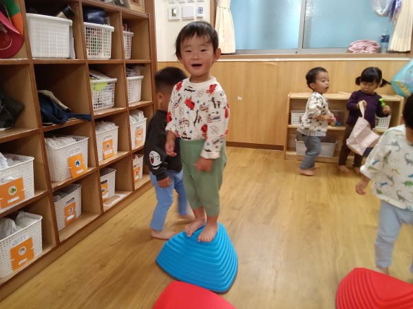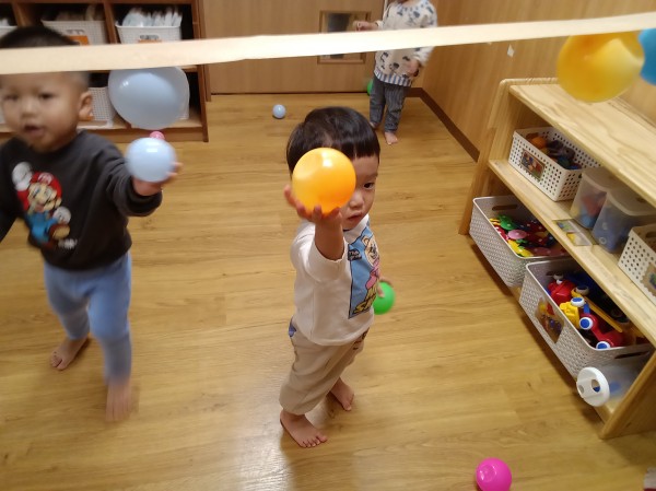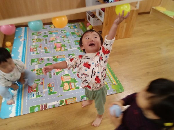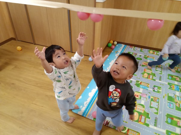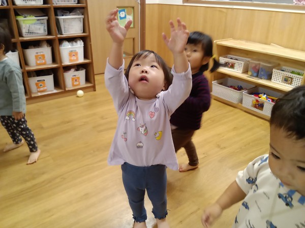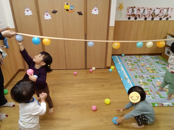 今日は、運動会の予行練習があり、保育者と一緒に走ったり親子競技の練習をしました。いつもと異なる雰囲気に圧倒されるお友だちもいましたが、保育者と一緒だと安心した様子で楽しそうに参加していた子どもたちです。その後、お部屋で運動遊びコーナーとおままごとコーナーに分かれて遊びました。また、テープとソフトボールを使ってくっつけたり剥がしたりして遊びました。一所懸命腕を伸ばしたり背伸びをしたり…指先や全身を使いながら笑顔いっぱいで楽しむ子どもたちでした。