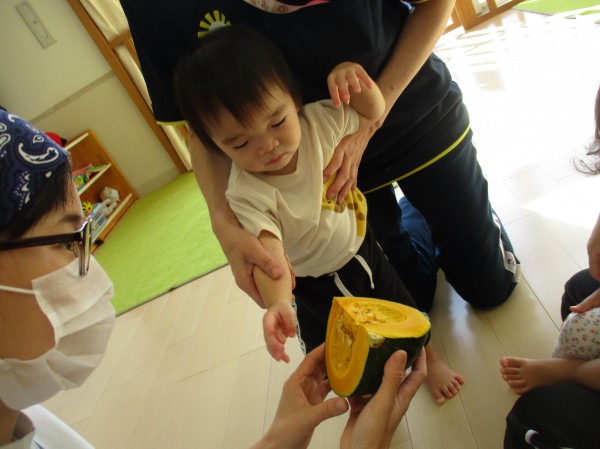 こどもの家・志木中宗岡 10月の食育 「かぼちゃに触れたよ☆」 たまご組(0歳児)