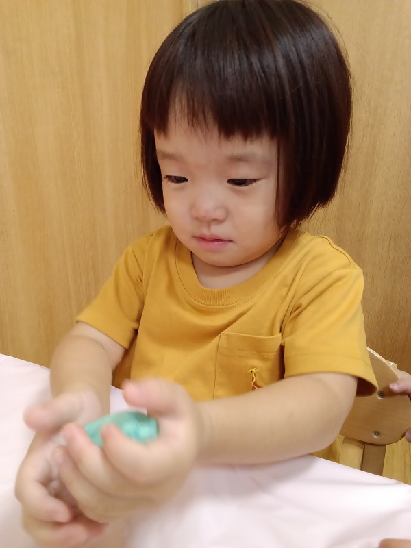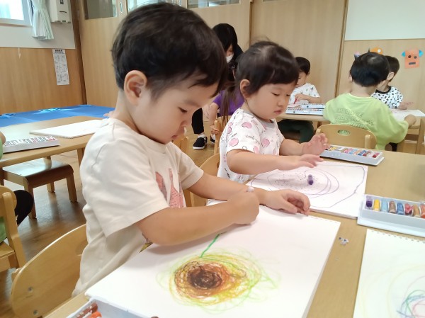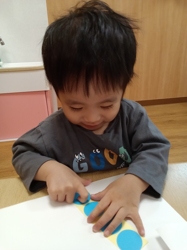 クレヨンを持って描いたり、シール貼りをしたり、粘土遊びなども楽しんでいます(^^♪