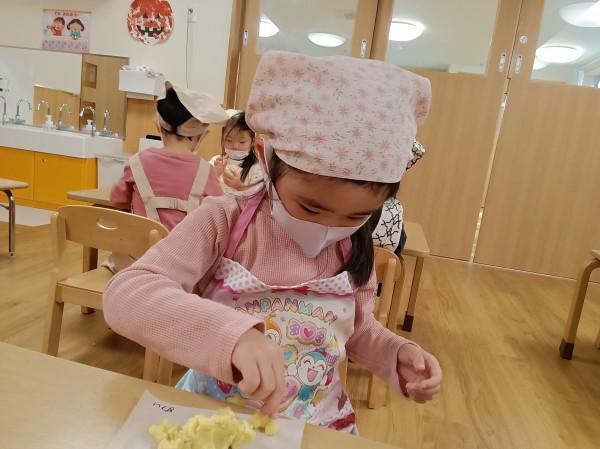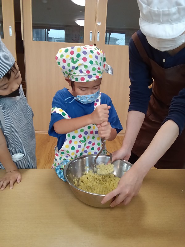 5歳児ぞう組は、蒸かしたさつまいもを潰す生地作りから行いました。