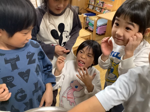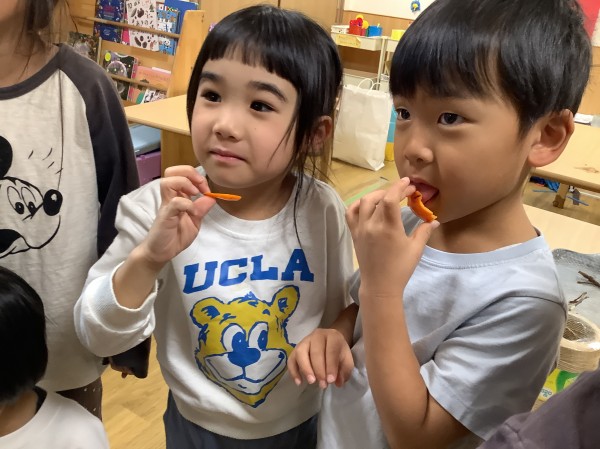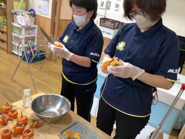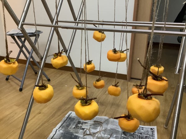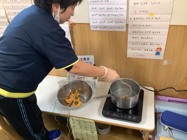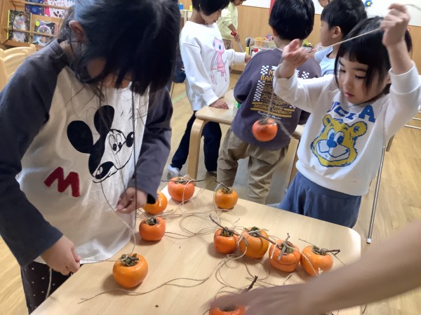 今年も去年に引き続き渋柿を地域の方から頂きました。早速干し柿作りをしようとぞう組の子ども達を誘うと大張り切り。柿の紐付けを頼むと夢中になって一つずつ丁寧に結びつけてくれました。「渋柿ってどんな味だろう?」と疑問の声があがったので、みんなで皮を舐めて味見をしてみました。「柿と同じ味だよ」と話しているとだんだん渋みが口に広がりびっくり!普通の柿との違いも知ることができました。また何故熱湯消毒をするのか、お酒を吹きかけるのかについても話しを聞き、知ることができました。