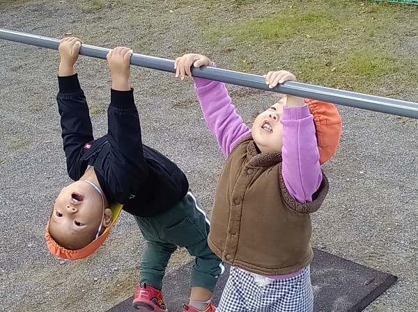 今日はりす組5名とうさぎ組一緒に公園に行ってきました。年上児が「て、つなご!」と優しく声をかけ、異年齢で手を繋いで仲よくお散歩することができました。少し緊張していたりす組さんたちでしたが、公園に着くとうさぎ組のお兄さん・お姉さんと一緒に元気いっぱいに走り回ったり、かくれんぼや落ち葉拾いを楽しんでいました。うさぎ組も負けじと「待ってー!」と元気いっぱいに走り回って、「みつけたぞ!」とかくれんぼをして遊びました。その後は砂場や大型遊具をくぐったり、登ったりして楽しく過ごしました。帰り道、りす組はもくもくと歩いていましたが、うさぎ組は「今日の給食何かな?」「お腹空いたよ!」と終始、お話が止まらずにぎやかに帰ってきました。