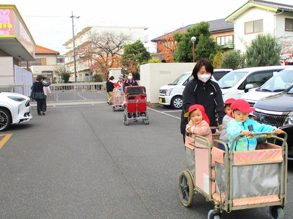 秋晴れの心地よい日、あひる組は散歩に出かけました。