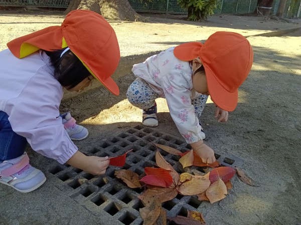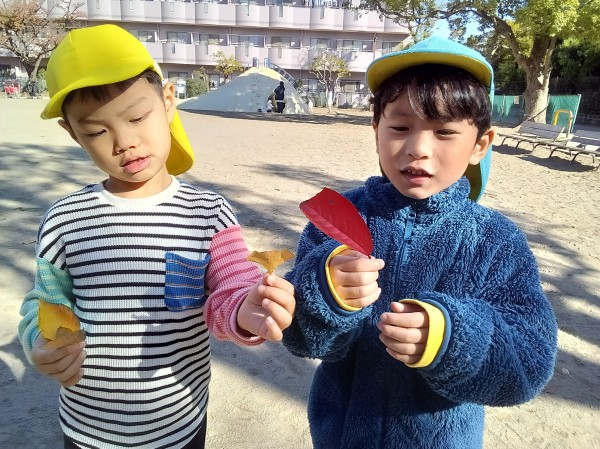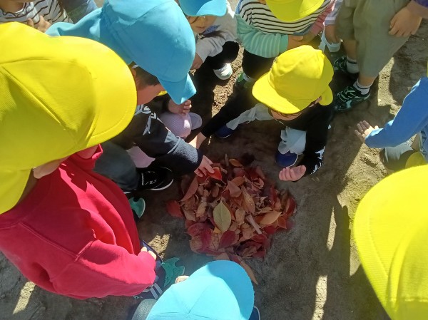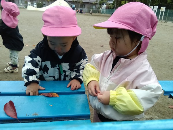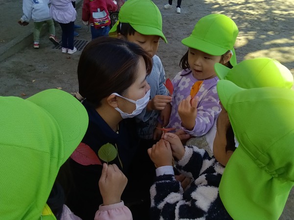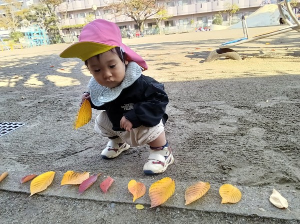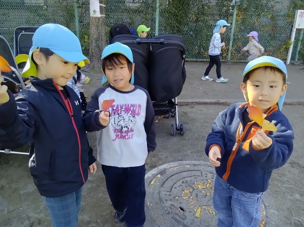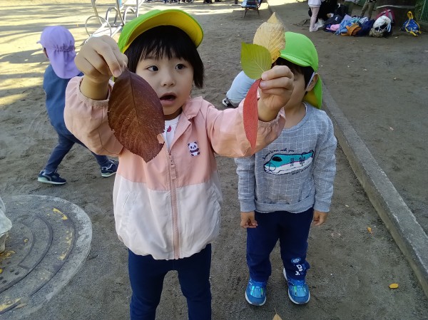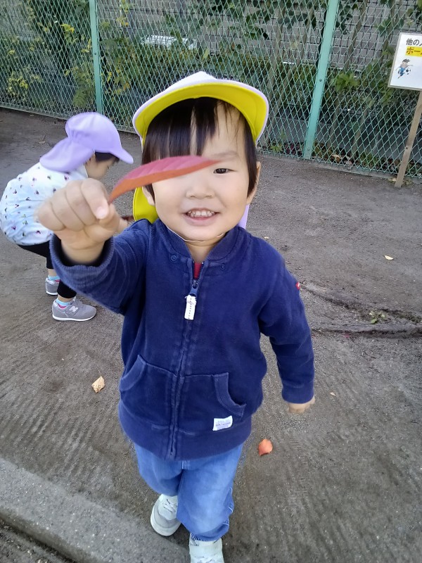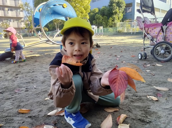 11月。保育園では、1日「紅葉狩り」の日を設け、各クラス散歩先の公園で紅葉狩りを楽しみました。