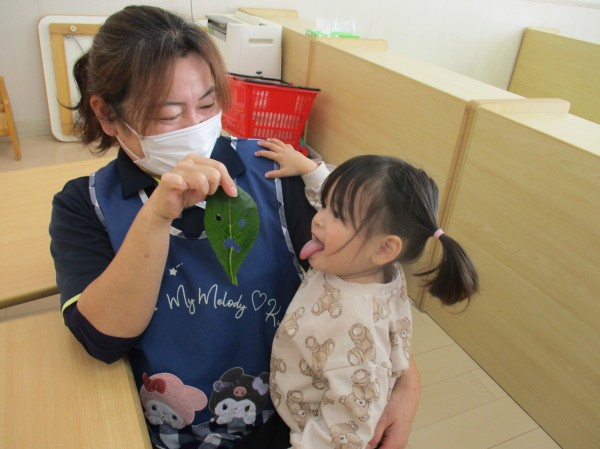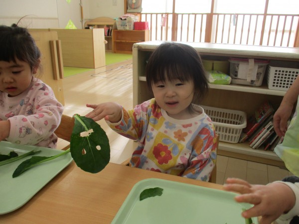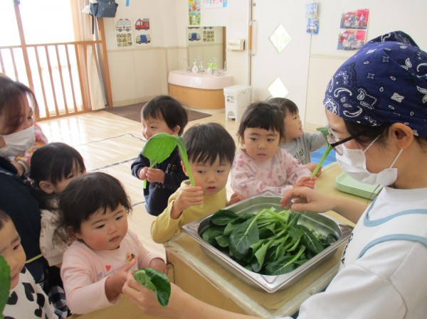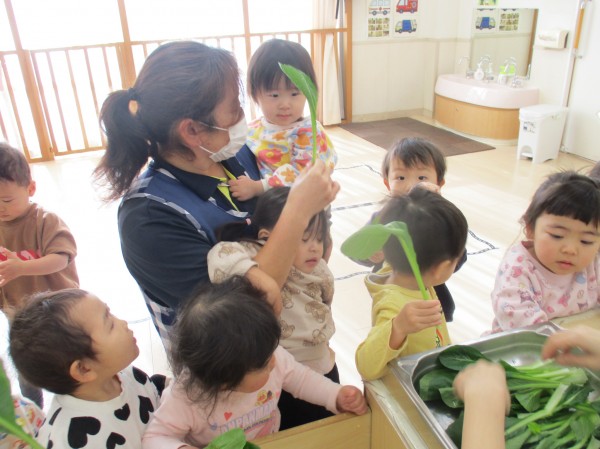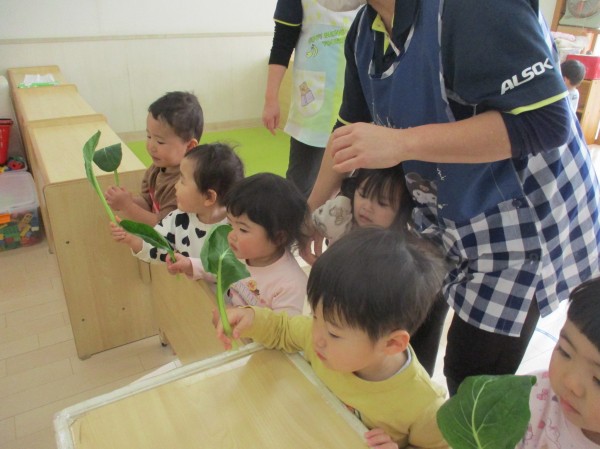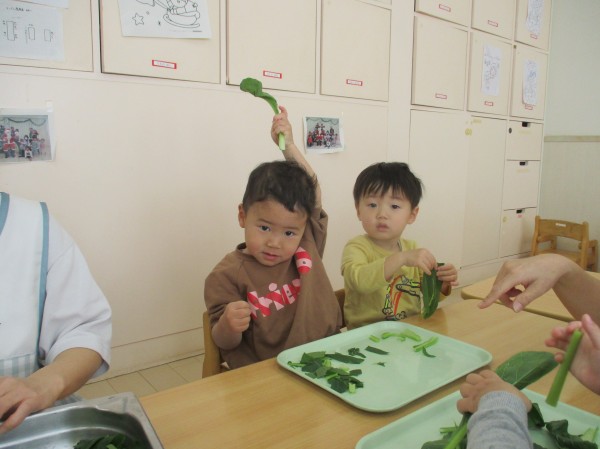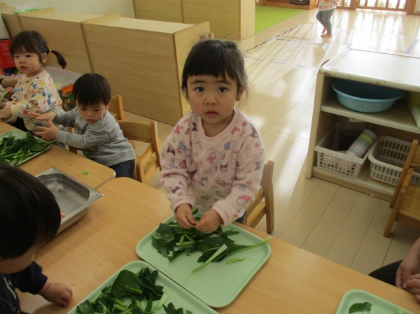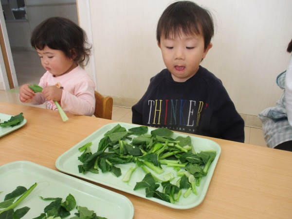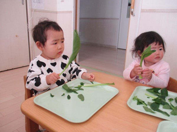 こどもの家・志木中宗岡 食育☆小松菜ちぎり あひる組(1歳)