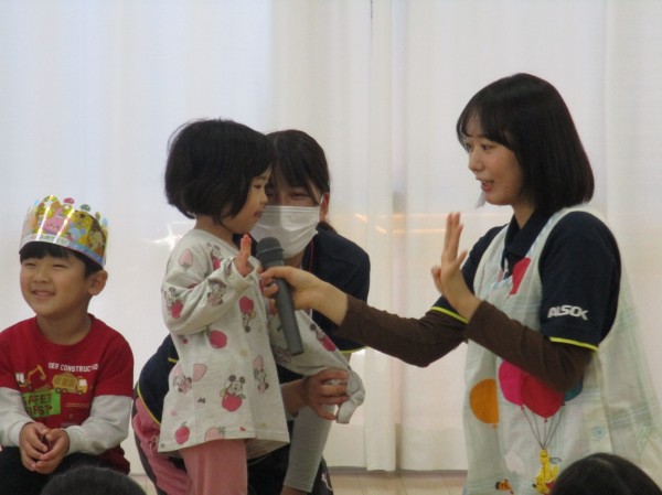 1月生まれはみんな幼児クラスの子達だったので【お名前】【年齢】【好きな遊び】を聞くと緊張しながらもしっかりとインタビューに答えてくれました☆