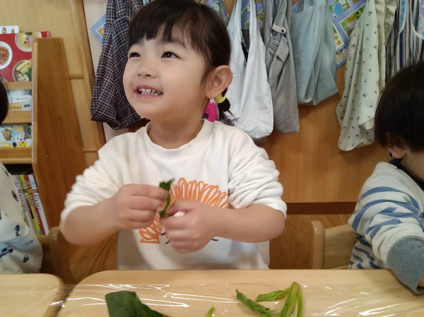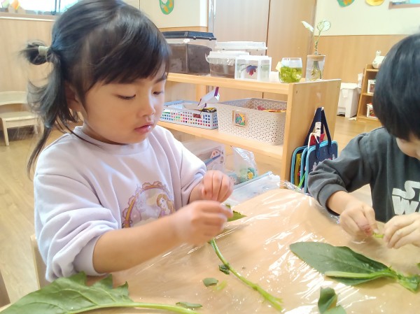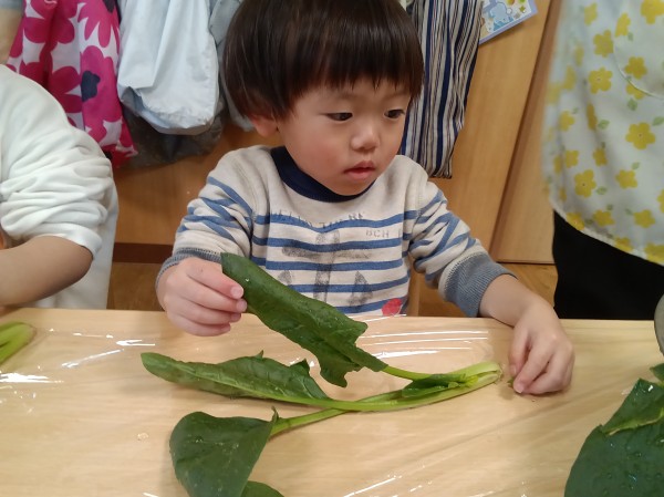 子どもたちは栄養士からほうれん草を手渡され、葉や茎の部分を見たり触って匂いを嗅いだり
