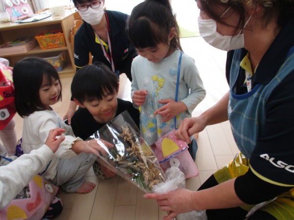 幼児組さんでは鬼の嫌いな柊のチクチクを触って、 鰯の匂いを体験してもらいました。