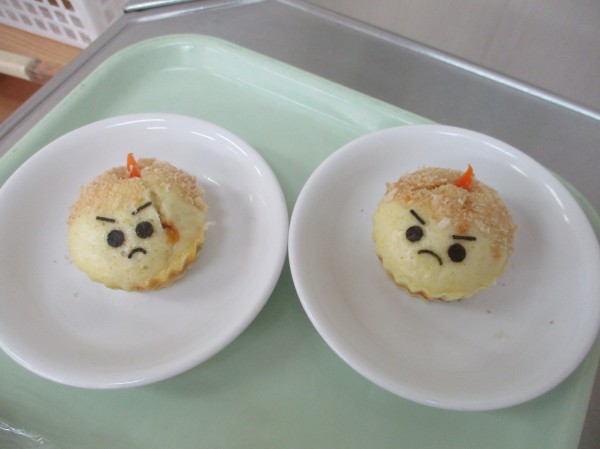 おやつに可愛い鬼のカレー蒸しパンを食べて