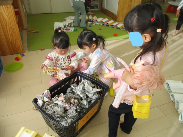 まずは新聞紙で豆作り。大きいの、小さいの・・・子どもたちが一生懸命手作りしました。