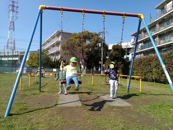 今日はぱんだ組だけで公園へ散歩に行きました。「今日はぱんだ組だけだよ」と伝えると「やった!」「よっしゃー!」と大喜びでした。準備もスムーズで早々に保育園を出発しました。公園では鬼ごっこをしたり、ブランコ、滑り台の遊具で遊びました。「一緒に遊ぼう」「入れて」など自分たちで声を掛け合って友だち同士仲良く遊ぶ姿が見られました。