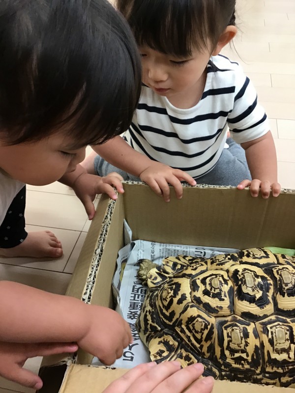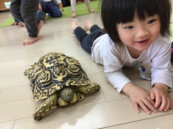 こどもの家保育園定員87名。そして88人目の園児?! カメのかーくんです。卒園児のおうちのカメさんですが、時々保育園を忘れずに登園してきてくれます。初めて来たときは、体長15センチ?ぐらいの子亀さんでしたが、あれよあれよとこんなにおおきくなりました。登園してくるとかーくんの周りには、こどもたちがたくさん集まります。 あかちゃん組にご挨拶中・・・ 突然のかーくんの訪問にびっくり!!の子は遠くから見つめます。恐る恐る近づいてご挨拶(^^)/