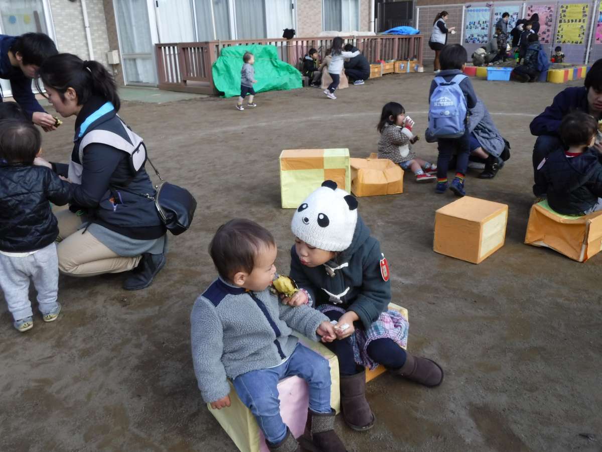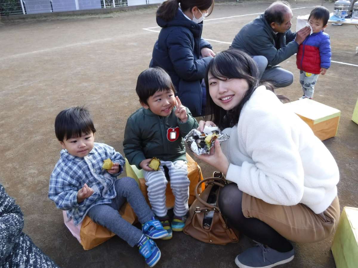 だんだんと集まってきた子どもたちが、あつあつの黄色いやきいもをひなたに座り込んでふぅふぅしながらほおばります。甘くてほっぺがおっこちそう。誰もが、にっこり。日頃、仕事が忙しくてなかなか交流出来ない保護者の方同士も焼き芋を片手に、たき火のまわりでおしゃべりがはずみます。