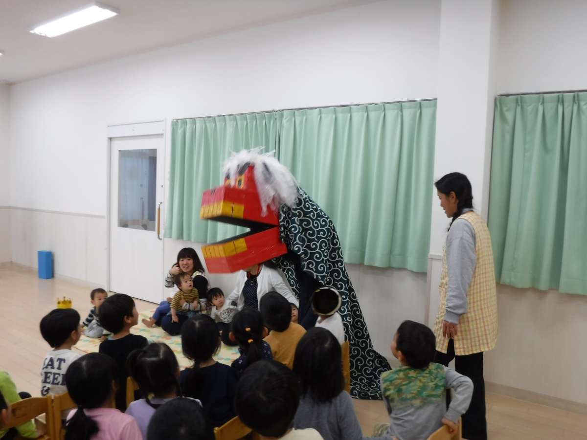 保育園名物の獅子舞いに目をまるくする子どもたちです。