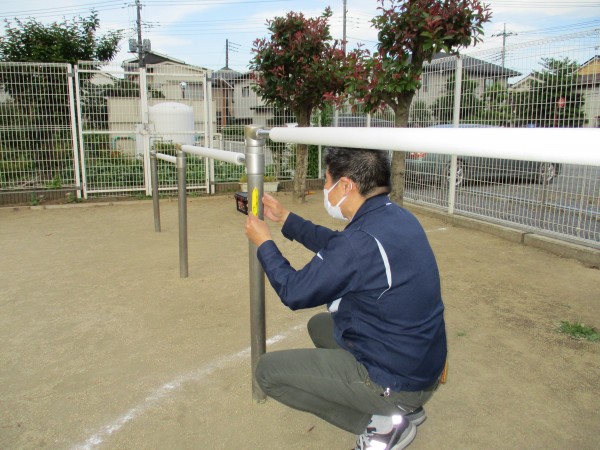 支柱の揺れやまっすぐに立っているか?サビや腐敗はないか?・・・・念入りに慎重に調査中・・・(#^.^#)鉄棒の白いカバーは、鉄棒を使っている子がいない時、そばで遊んでいる子が頭をごつっんこ★((+_+))しないためのカバーです。