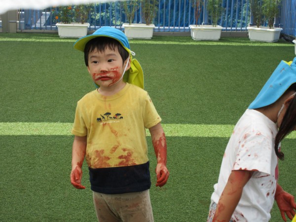 タコ壺作すると、夢中になって自分の顔や髪の毛、洋服まで茶色く色づけてしまうのでした。