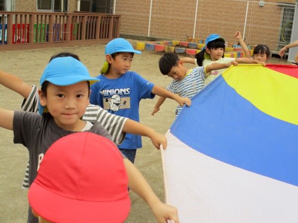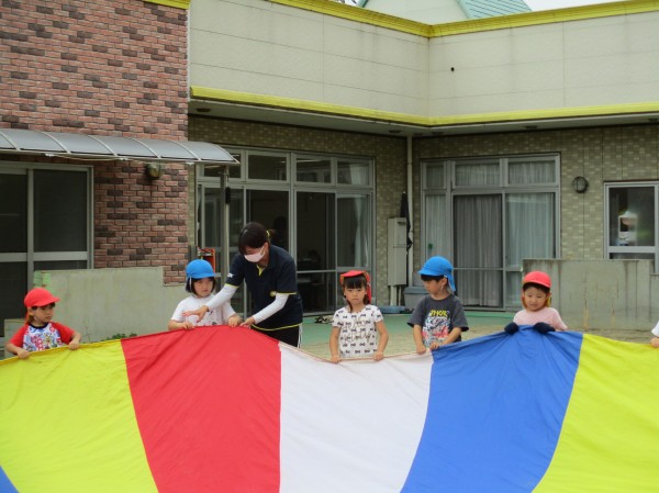 ばら組(4歳クラス)、ゆり組(5歳クラス)はパラバルーンの練習をしました。